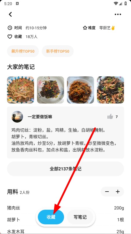 4、在菜谱用料及笔记页面,点击收藏,将菜谱收藏以便后续查看。