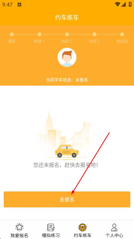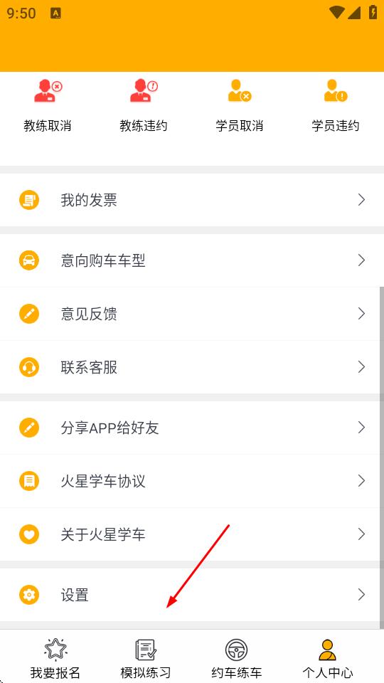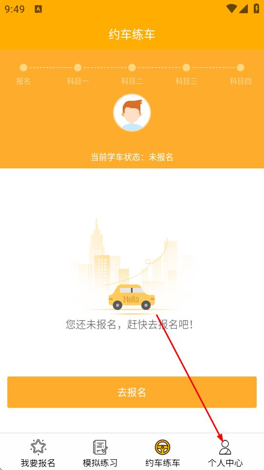 1、打开火星学车APP,进入约车练车页面,点击底部导航栏中的个人中心。