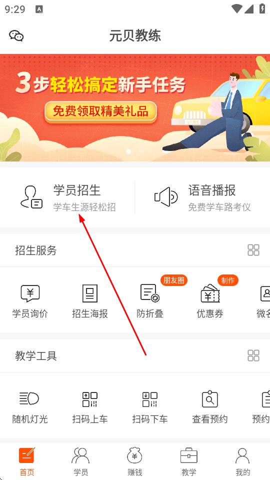 1、打开元贝教练APP,进入APP首页,点击学员招生。