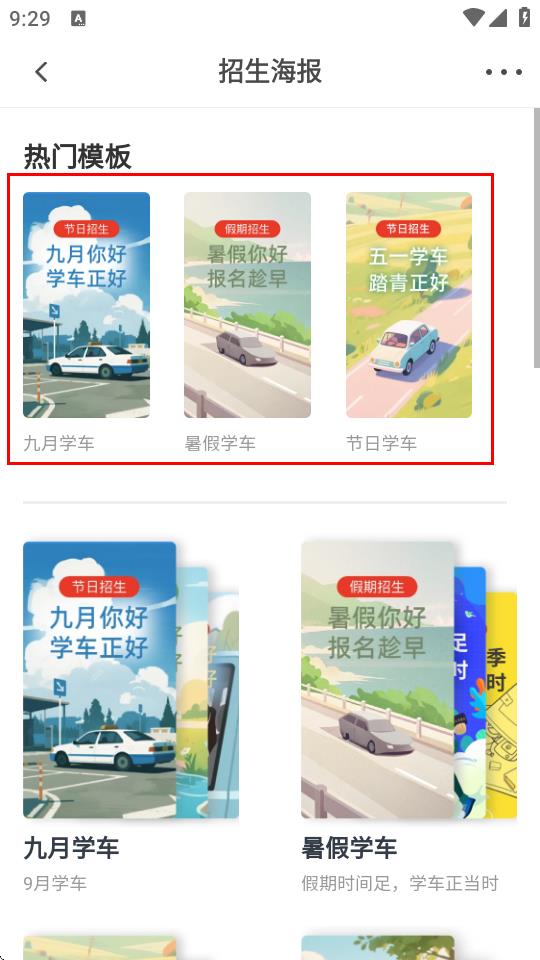 3、选择招生海报,从热门模板里挑选合适的样式,进行个性化编辑后,用于朋友圈等渠道的招生宣传。