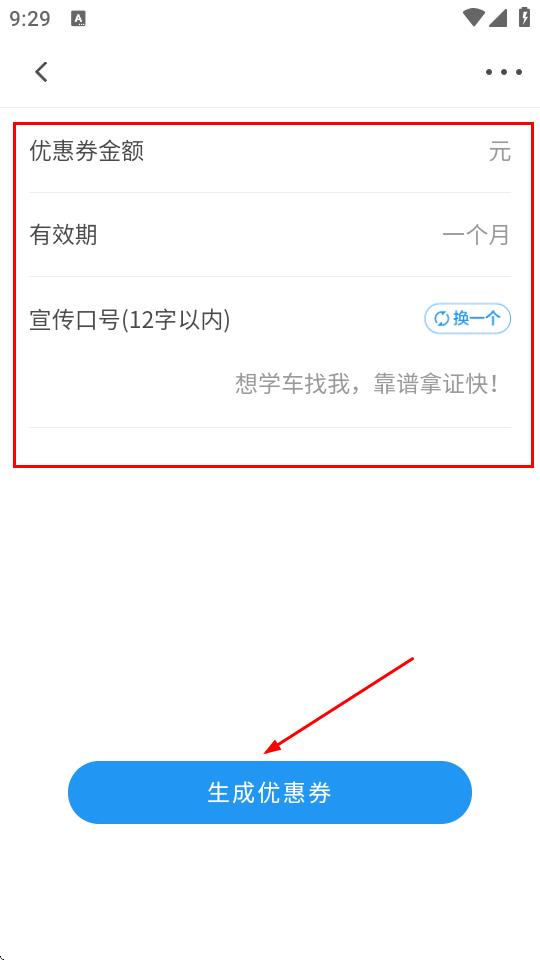 4、点击学车优惠券,设置优惠券金额、有效期、宣传口号等内容,点击生成优惠券,以此吸引学员报名。