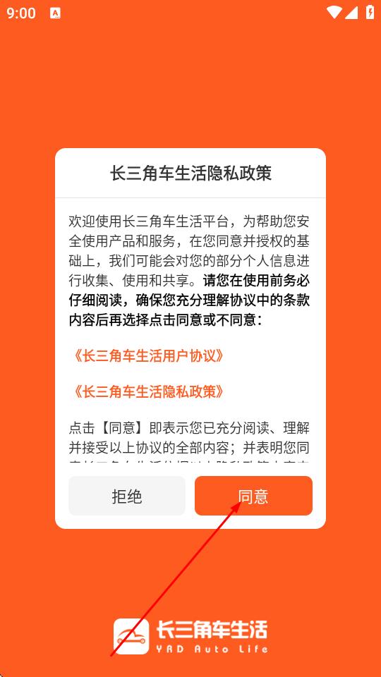 1、打开长三角车生活APP,在隐私政策页面点击同意。