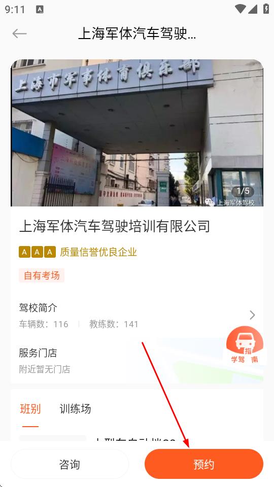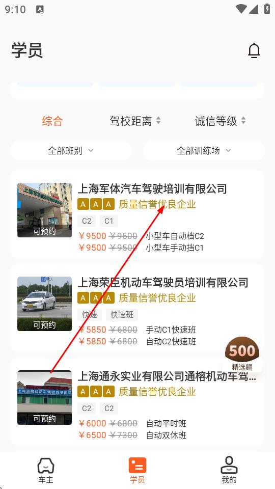 2、进入APP主界面,点击底部导航栏中的学员,浏览驾校列表,选择想要预约的驾校。