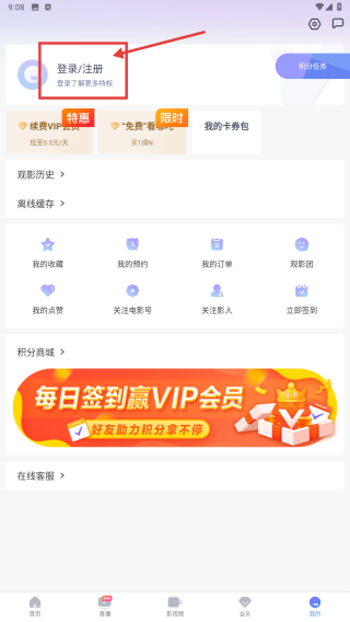 2、在个人中心,点击登录/注册选项,进入登录方式选择界面。