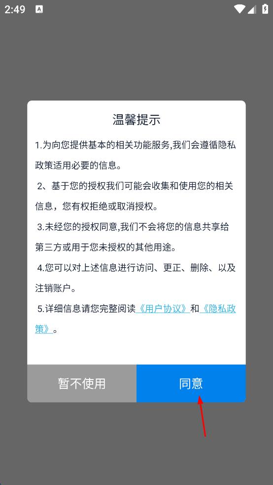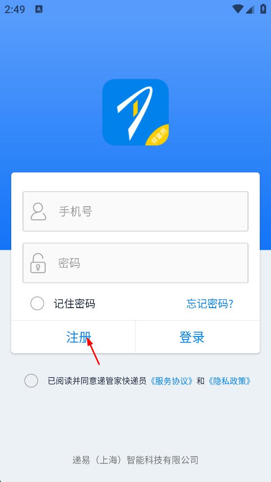 1、打开递管家快递员APP,在“温馨提示”弹窗中,点击“同意”,进入登录注册页面。