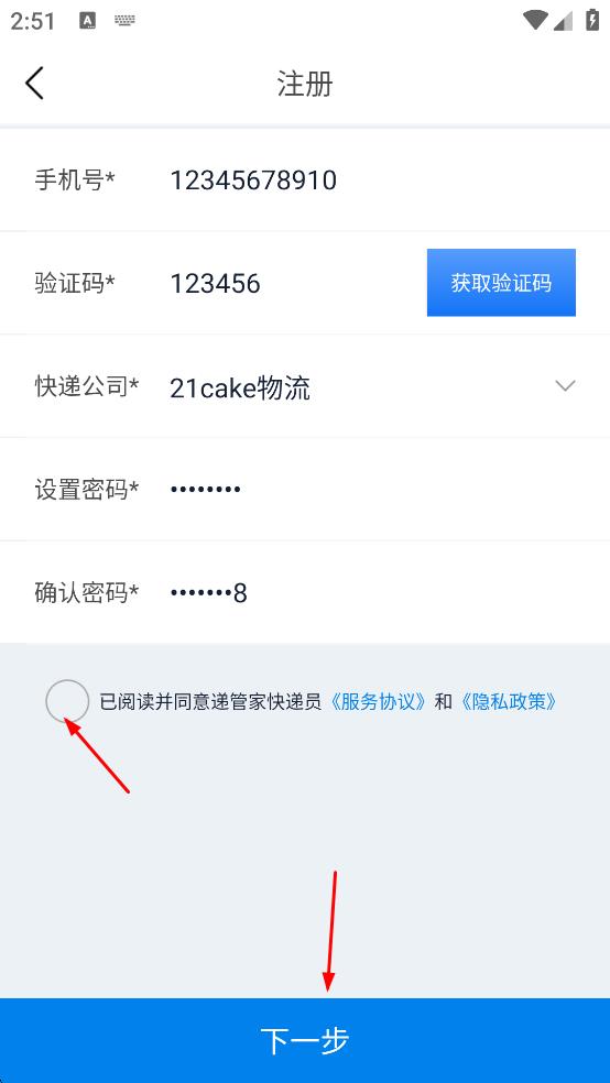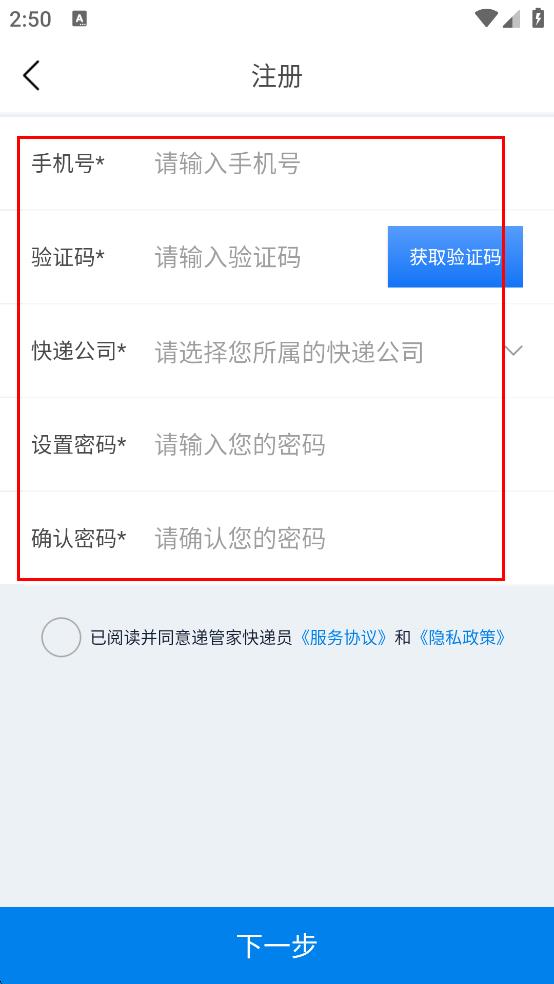 4、勾选“已阅读并同意递管家快递员服务协议和隐私政策,点击“下一步”,按照后续提示完成注册。