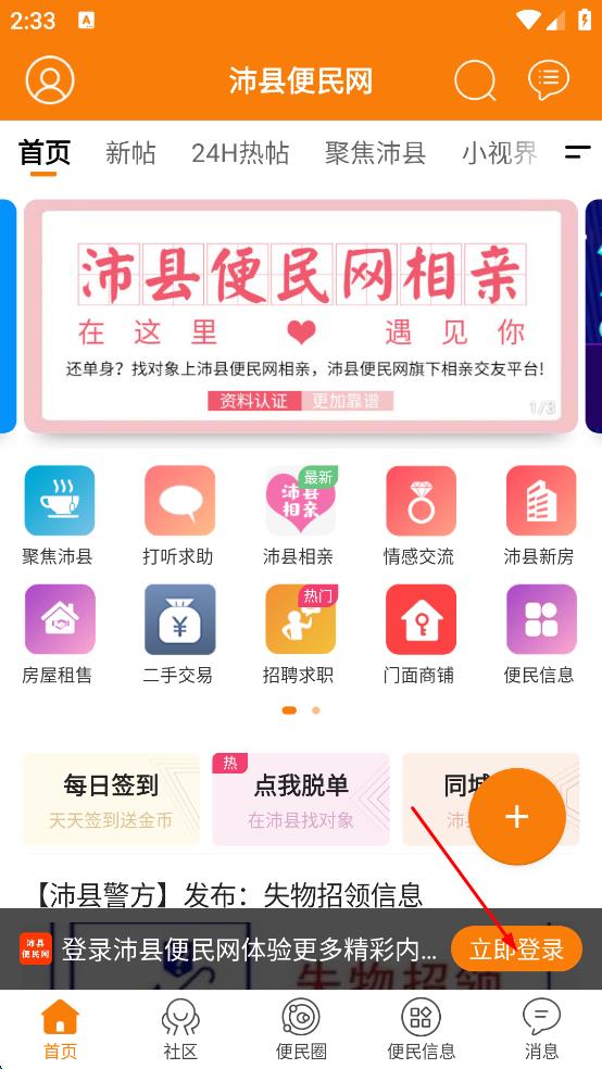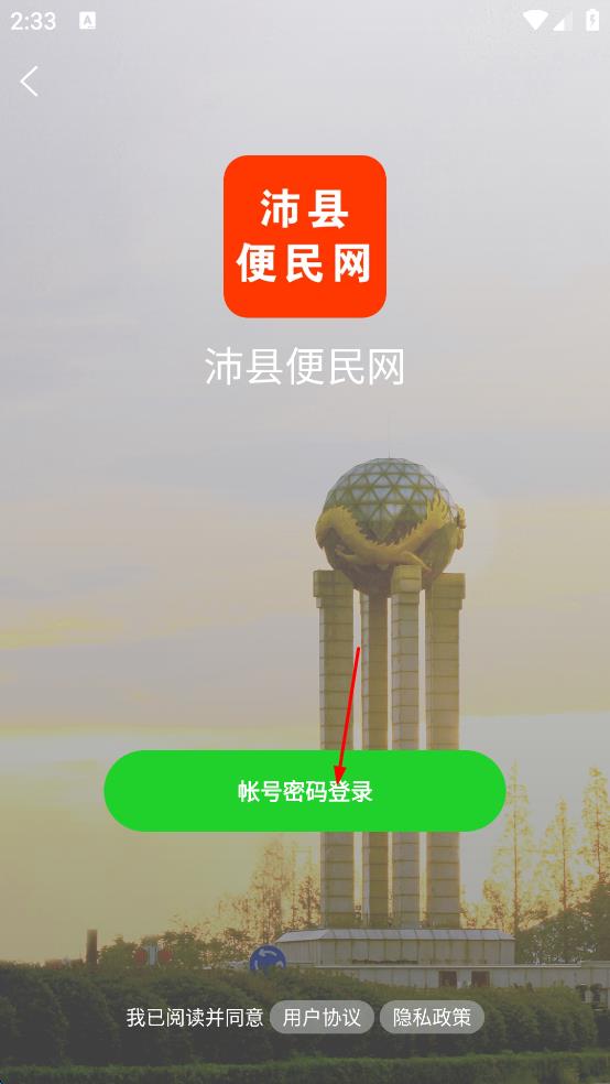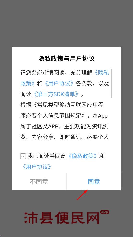 1、打开沛县便民网APP,在“隐私政策与用户协议”弹窗中,勾选“我已阅读并同意隐私政策和用户协议,点击“同意”,进入APP首页。