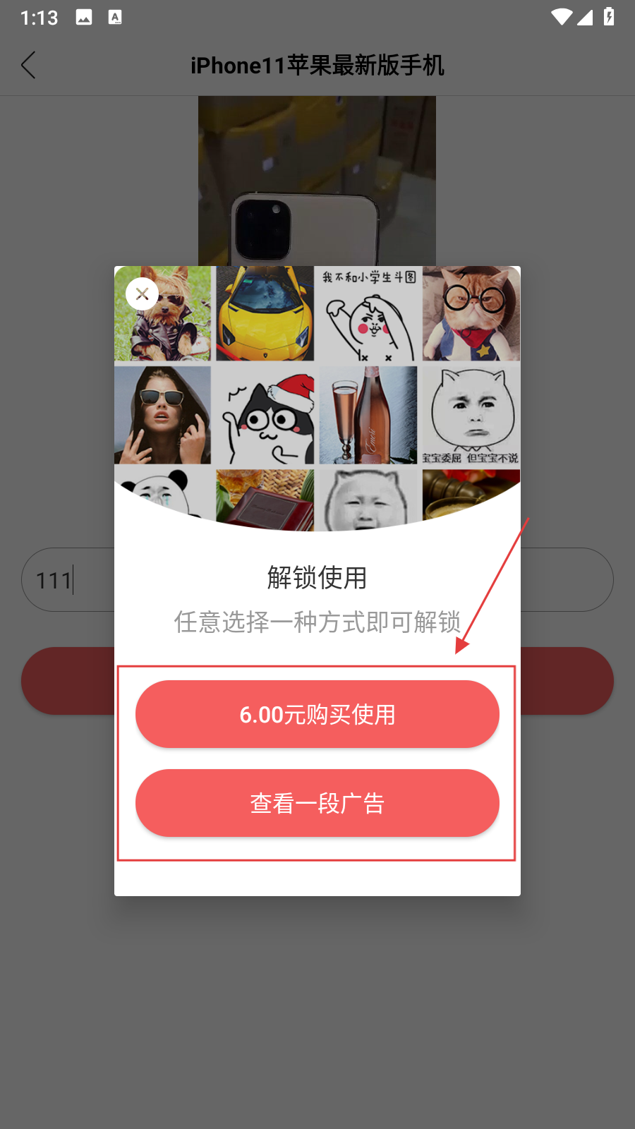 4、点击一键解锁后,弹出解锁使用的选项窗口,可选择6.00元购买使用或查看一段广告的方式。