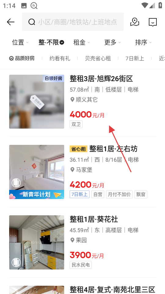 2、在房源列表页,选择感兴趣的房源如整租3居旭辉26街区,进入房源详情页。