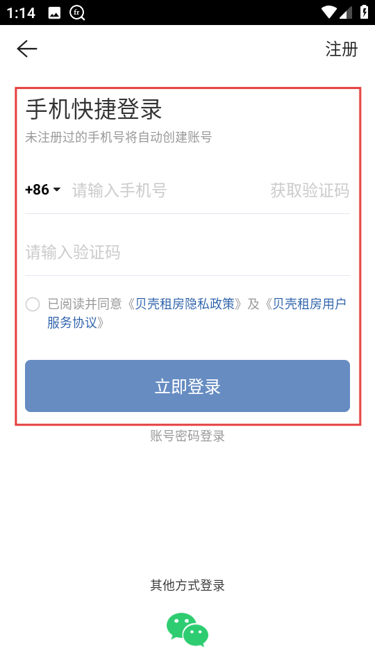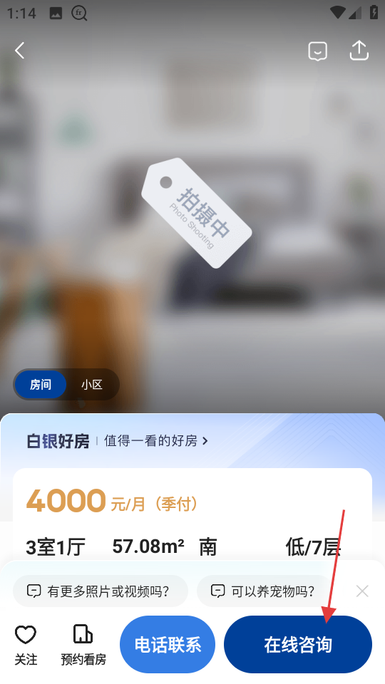 3、在房源详情页,点击在线咨询,若未登录会进入手机快捷登录页面。
