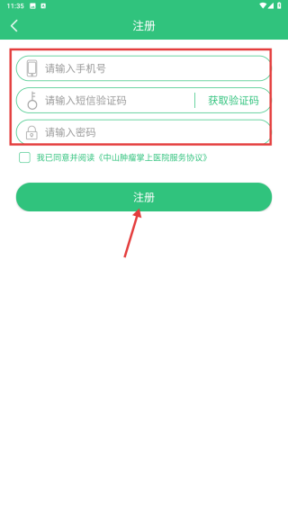 4、在注册页面,依次填写手机号、短信验证码、密码,勾选同意服务协议后,点击注册按钮完成账号注册。
