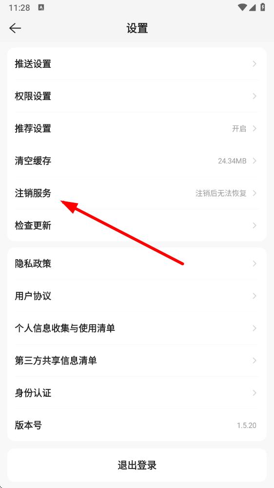 3、在设置页面中,向下滑动找到注销服务选项,点击进入注销相关界面。