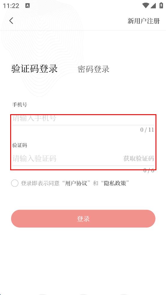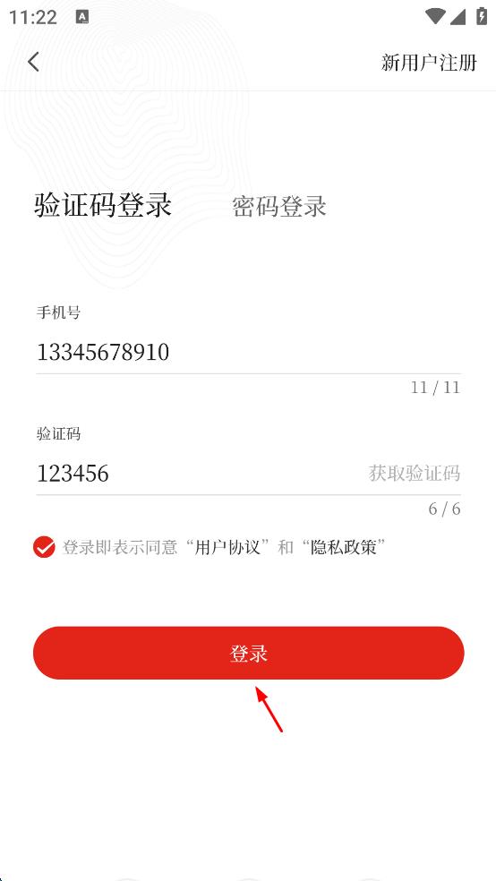 4、输入完验证码后,勾选“登录即表示同意‘用户协议’和‘隐私政策’”,最后点击红色的“登录”按钮,即可完成登录。