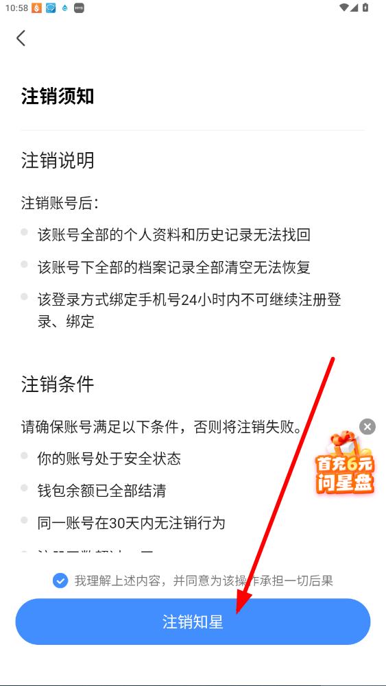 3、仔细阅读注销须知,勾选我理解上述内容,并同意为该操作承担一切后果,然后点击注销知星。