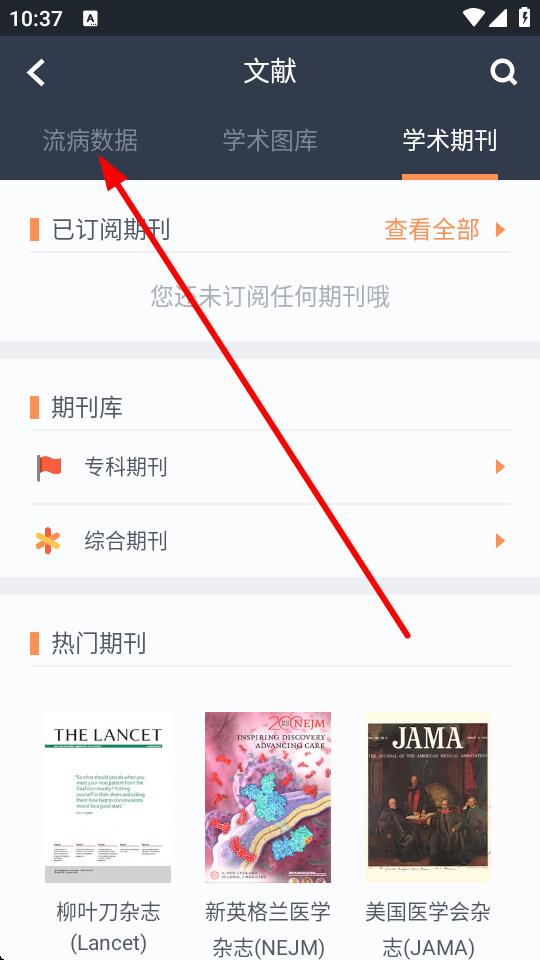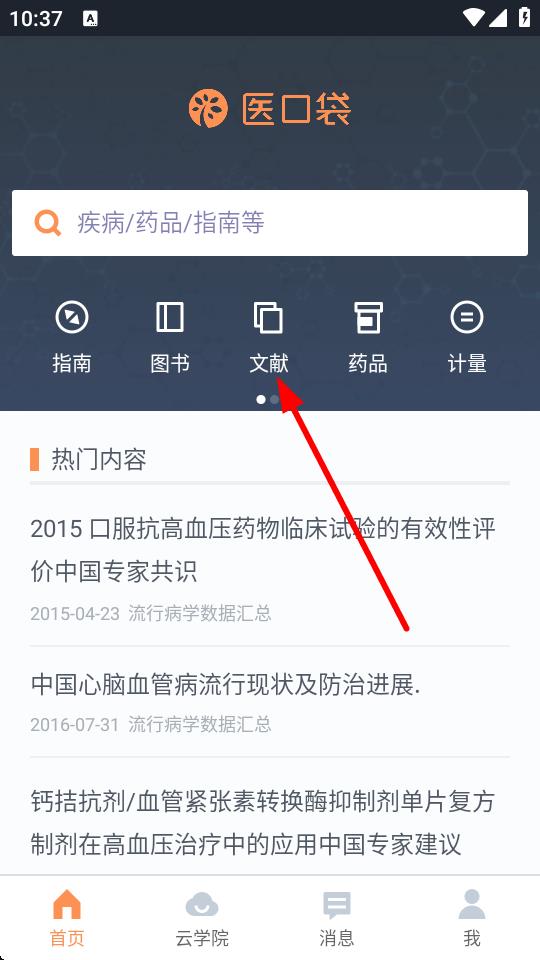 1、在医口袋app首页,点击上方导航栏中的文献选项。