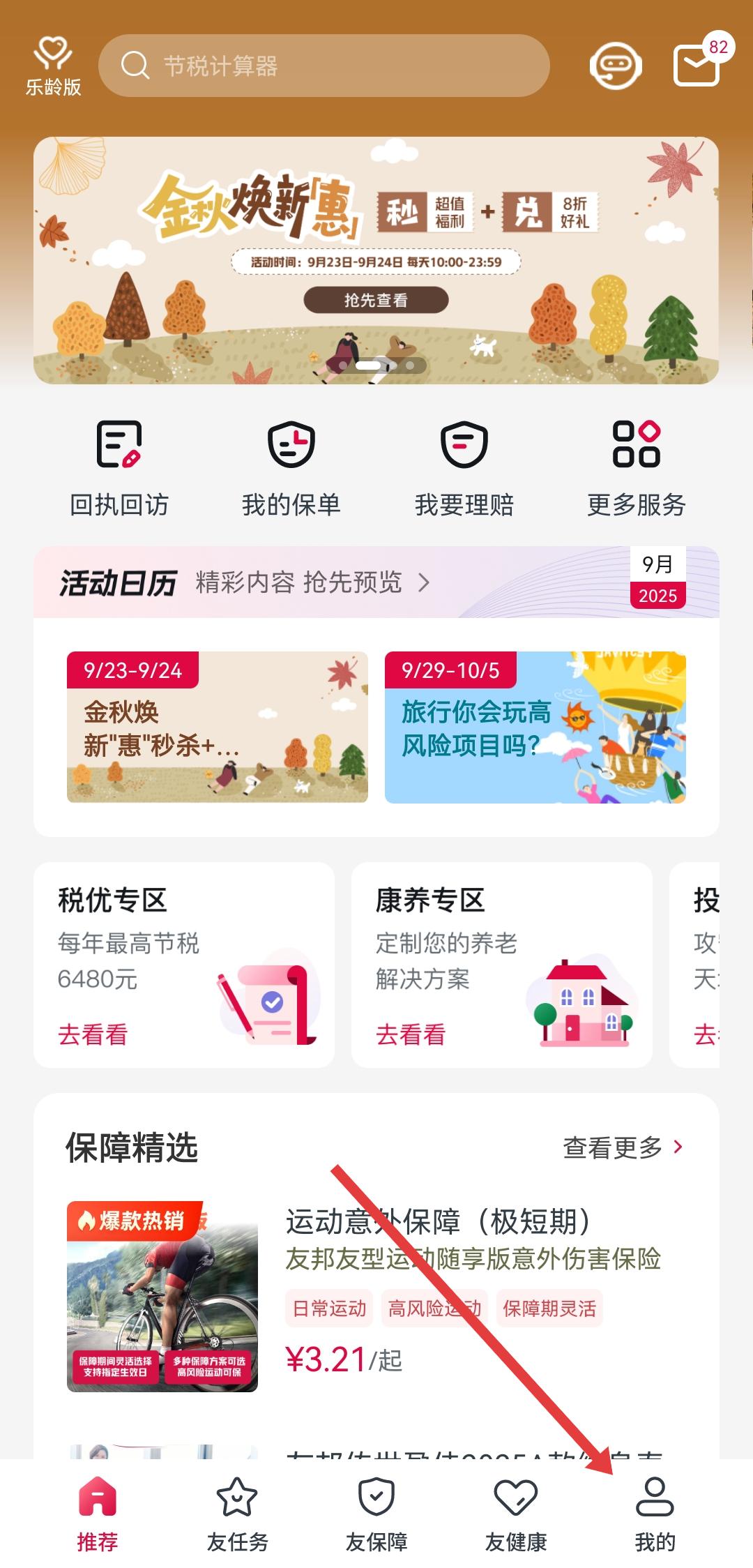 1、在友邦友享APP的首页,需要点击我的按钮,进入个人功能的页面。