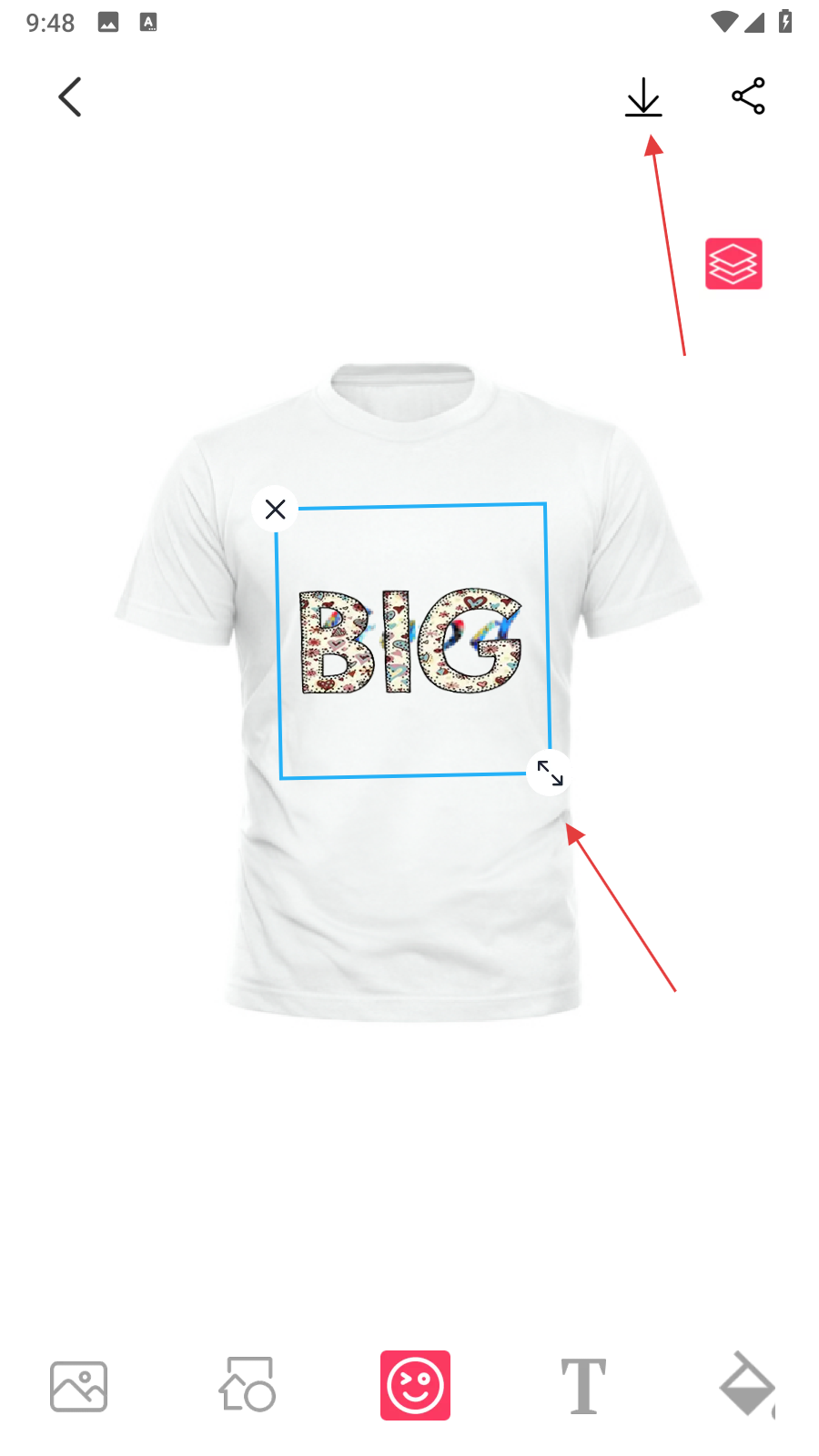 4、贴纸添加到T恤后,可通过调整框调整贴纸的大小和位置,调整完成后,点击页面右上角的下载按钮,保存设计好的T恤作品。