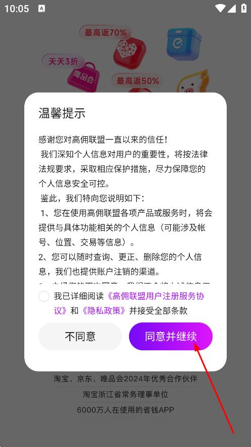 1、在温馨提示弹窗中,点击同意并继续,进入首页。