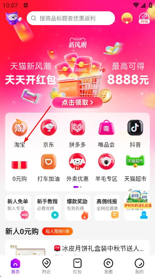2、在应用首页,点击淘宝图标,进入淘宝相关页面。