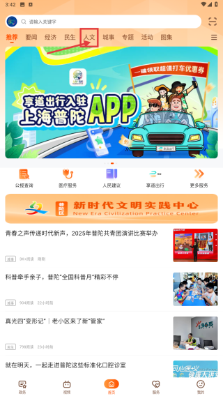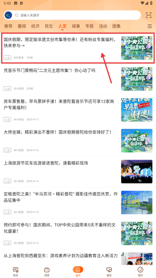 1、浏览本地资讯:打开软件后,首页默认展示普陀区最新资讯,也可通过顶部导航栏分类如“政务”“民生”“文化”筛选特定类型资讯,快速找到所需内容。