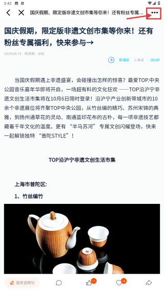 2、在人文资讯列表里,找到国庆假期,限定版非遗文创市集等你来!点击进入详情页。