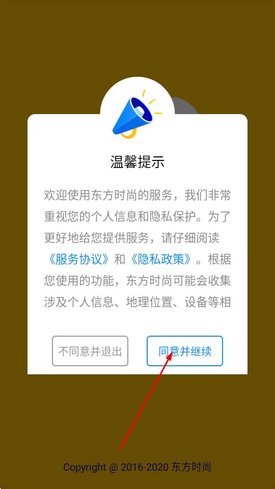 1、打开东方时尚会员俱乐部APP,在弹出的温馨提示窗口中,点击同意并继续按钮,进入APP主界面。