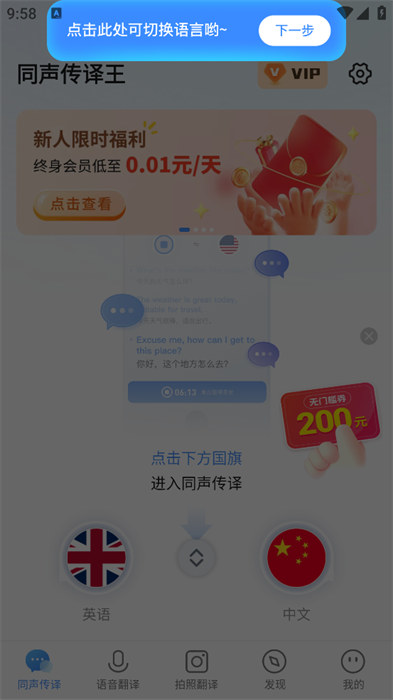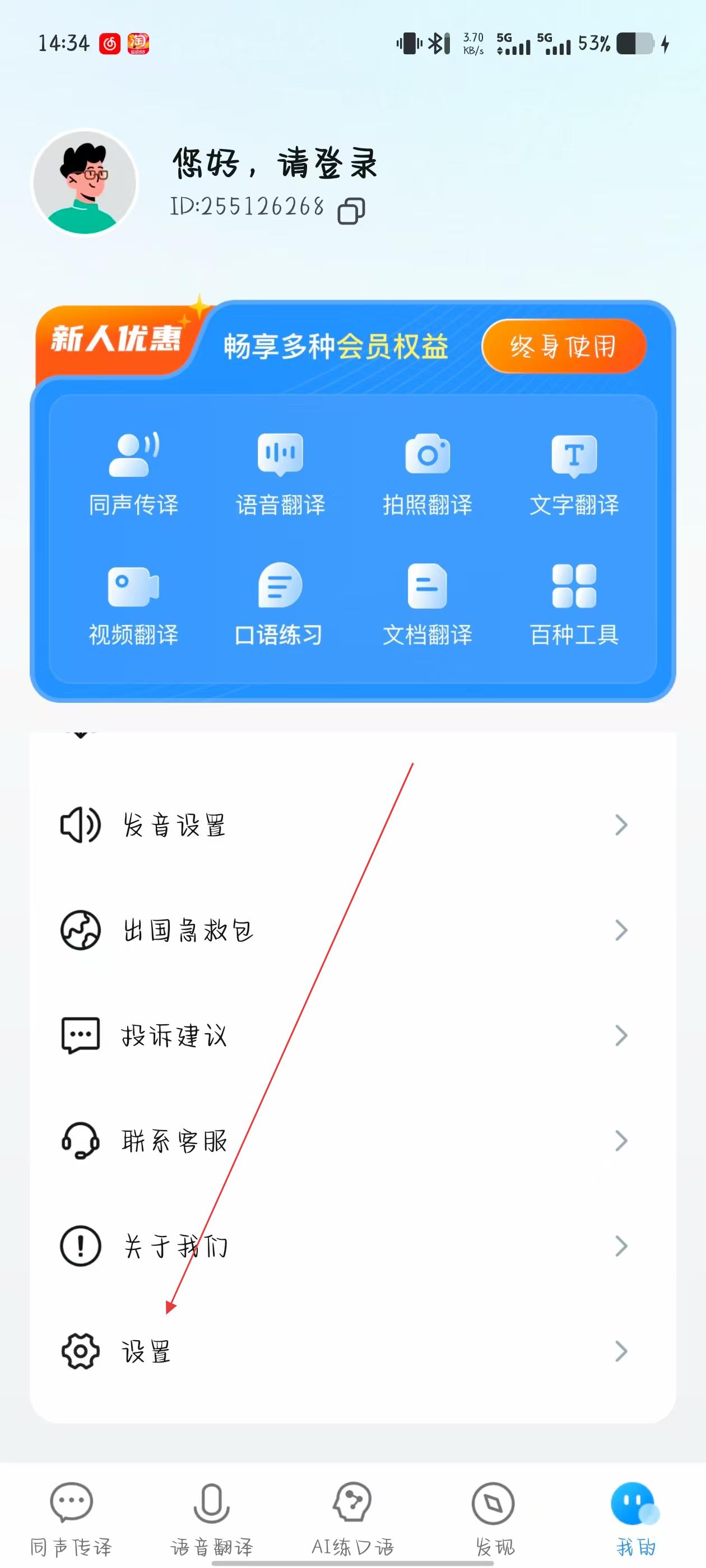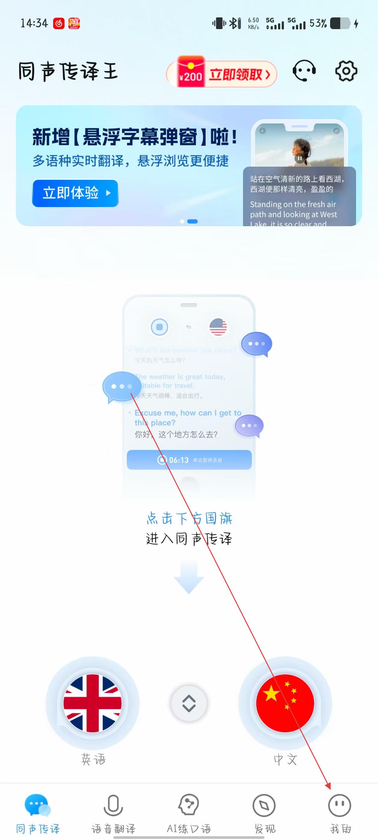 1、打开同声传译王应用,点击页面右下角我的,进入个人中心页面。