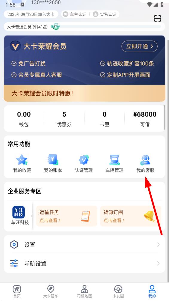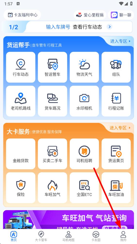 1、打开车旺大卡app,点击底部导航栏最右侧的我的选项。
