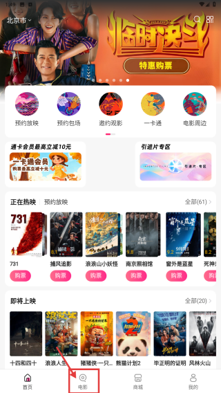 1、打开电影购票应用,点击底部电影选项,进入电影板块。