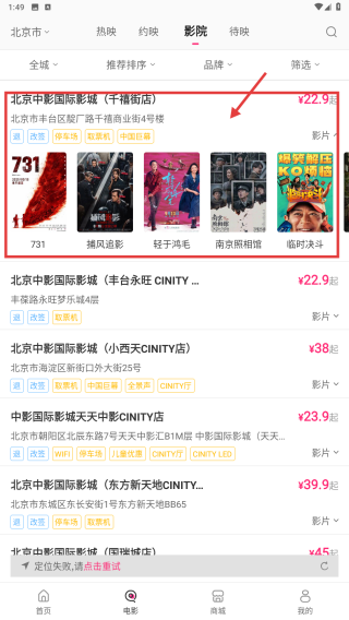 2、在电影板块中,点击影院选项,切换至影院列表页面,选择北京中影国际影城千禧街店。