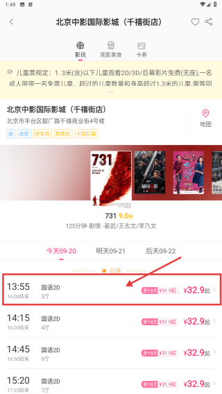 3、进入影院详情页后,选择电影731的场次,例如13:55场。