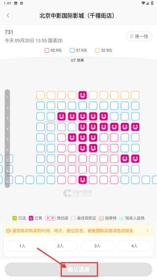 4、在选座界面,选择心仪的座位,点击确认选座按钮,完成电影选座操作。