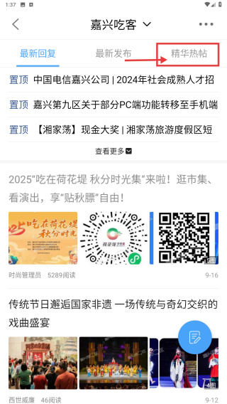 2、在嘉兴吃客板块中,点击精华热帖选项,切换至精华热帖展示页面。