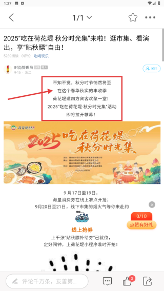 4、在热帖详情页,查看秋分时节消费盛宴的详细资讯,了解活动时间、线上抢券等信息。