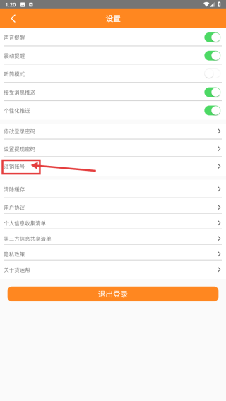 3、在设置界面,点击注销账号选项,进入注销风险提示页面。