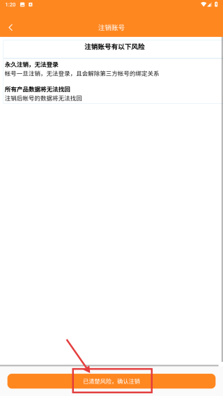 4、在注销风险提示页面,点击已清楚风险,确认注销按钮,完成账号注销操作。