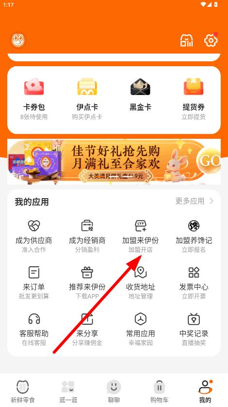 2、在个人中心页面的我的应用板块里,点击加盟来伊份选项,进入加盟相关界面。