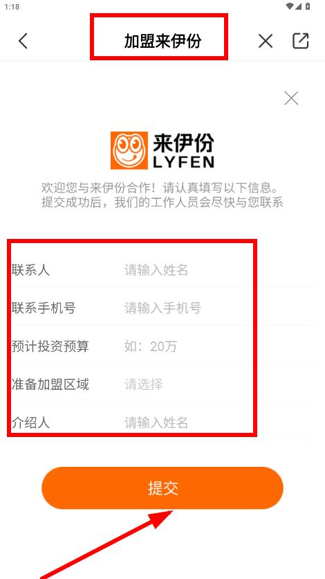 4、在弹出的加盟信息填写页面,依次填入信息,填写完成后点击提交,之后等待工作人员联系即可。