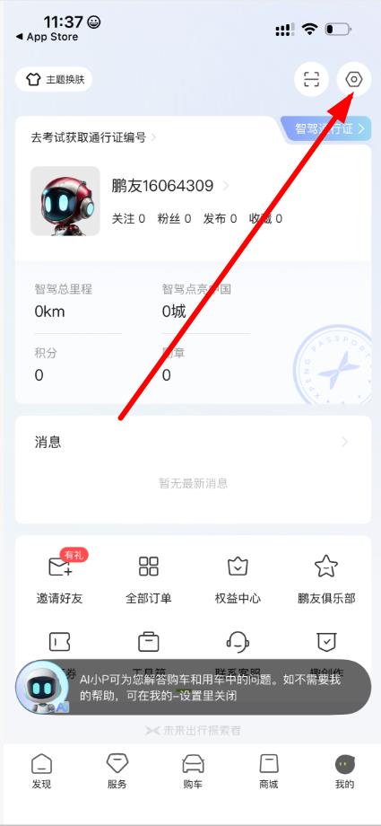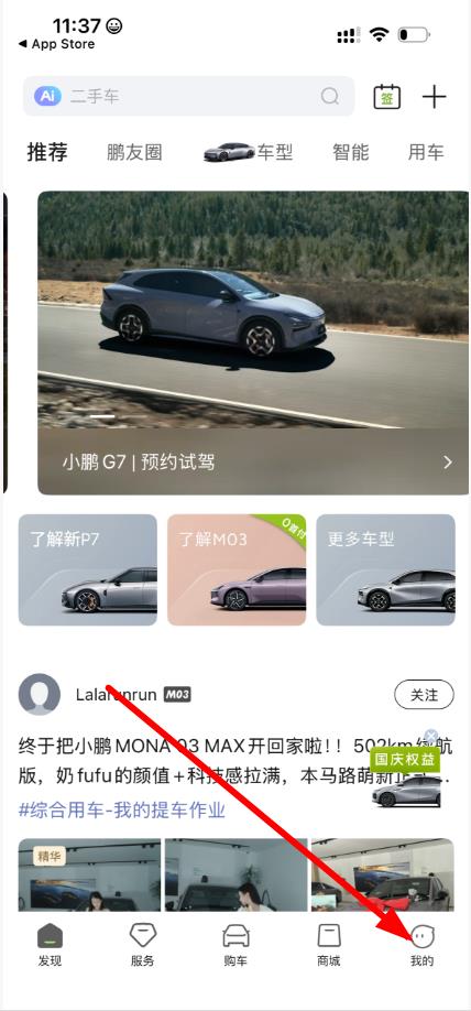 1、在小鹏汽车App界面,点击底部我的选项,进入个人中心页面。