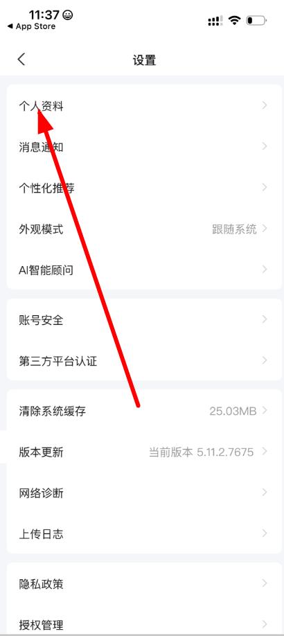 3、在设置界面,点击个人资料选项,进入个人资料编辑页面。