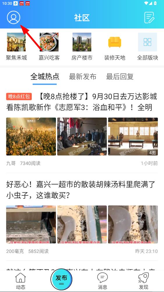 1、打开嘉兴第九区app,进入社区页面,点击左上角的头像图标,进入个人页面。
