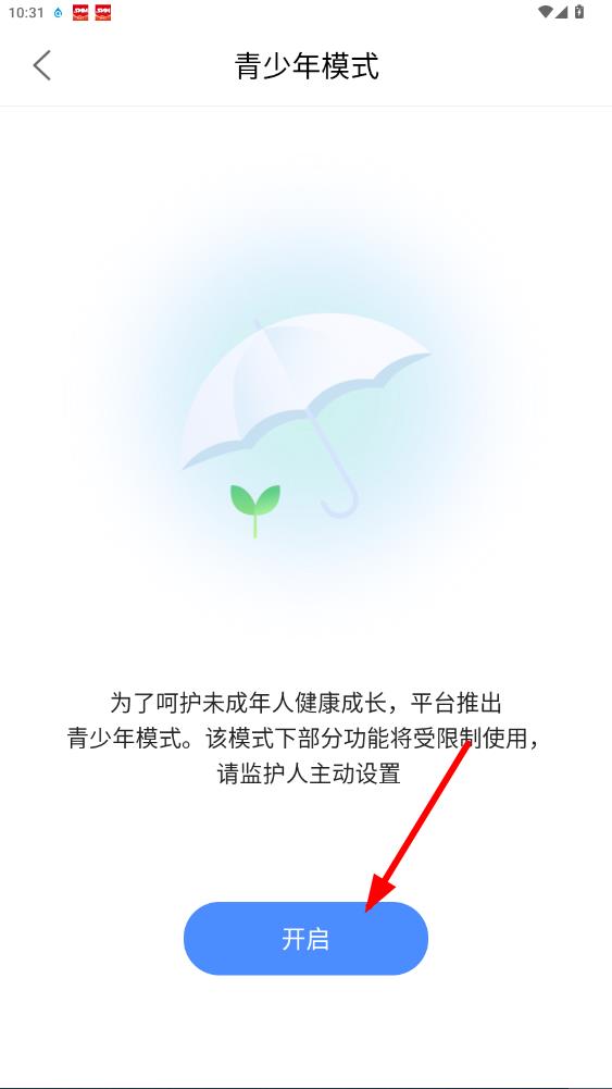 4、进入青少年模式页面后,点击底部的开启按钮,即可成功开启青少年模式。