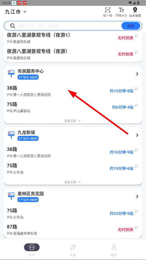 2、在首页能看九江市公交,如市民服务中心附近线路。