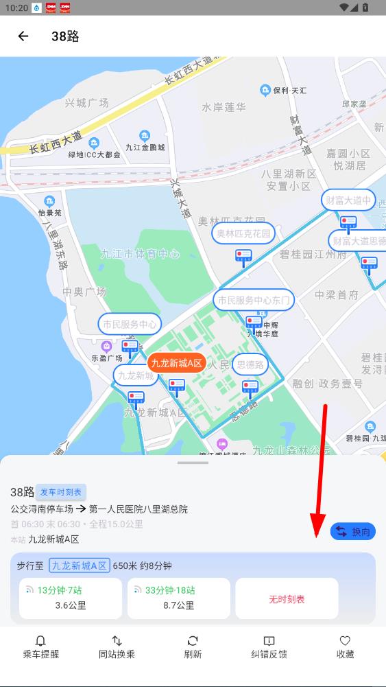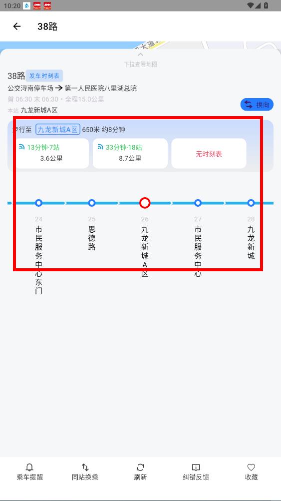 4、在38路详情页,能看九龙新城A区出发的行程方案。