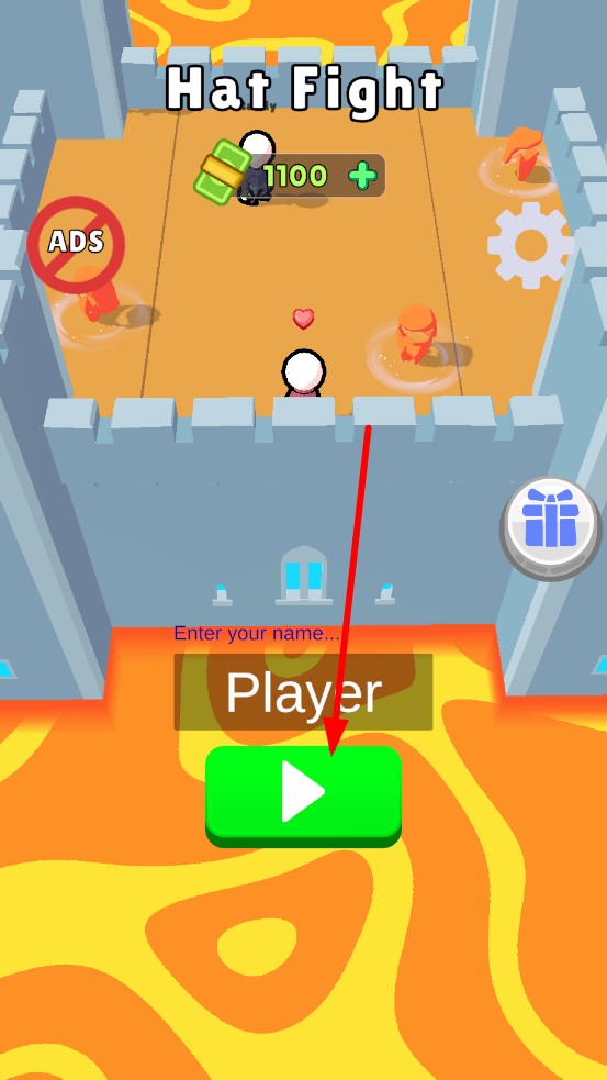 1、点击Play按钮,输入自定义名称进入初始竞技场,滑动屏幕操控移动人物,拾取帽子,获得武器进行攻击。