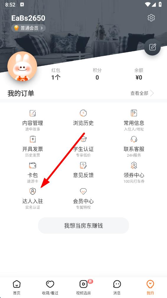 1、打开途家app,在首页点击底部导航栏最右侧我的按钮,进入相关页面。