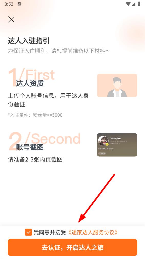 3、进入达人入驻指引页面后,确认满足粉丝量入驻条件,勾选同意协议后点击去认证,开启达人之旅。
