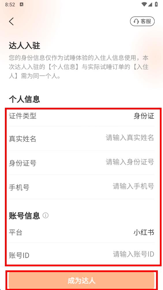 4、在达人入驻信息填写页,依次准确输入真实姓名、身份证号、手机号、选择平台,填写账号ID,点击成为达人完成入驻。