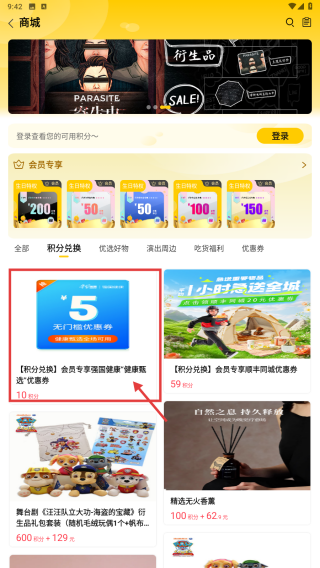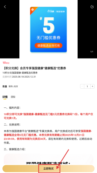 3、在商品列表里,点击积分兑换会员专享强国健康健康甄选优惠券条目,进入商品详情页。