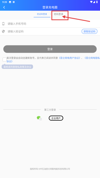 3、在登录界面,点击密码登录选项,切换至密码登录信息填写页。